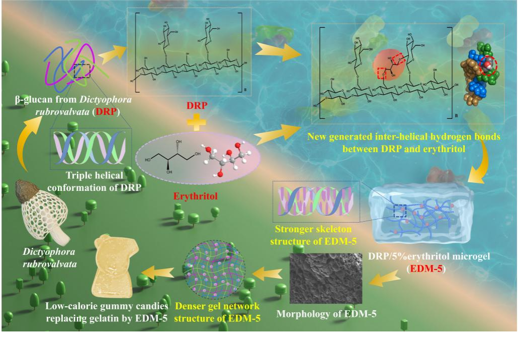 从红托竹荪中提取的β-葡聚糖(DRP)虽具有天然保健功效,但凝胶形成能力较弱,限制了其作为凝胶剂的应用。本研究深入探讨了赤藓糖醇诱导DRP在溶胶-微凝胶转变过程中形成的分子机制及凝胶演化过程,并评估了用微凝胶替代明胶在软糖中的可行性。实验结果表明,由5%(w/w)赤藓糖醇结合的DRP形成的微凝胶(EDM-5)展现出优异的持水能力和冻融稳定性。傅里叶变换红外光谱(FTIR)在3254 cm−1处的羟基振动峰与X射线衍射图谱中2θ=19◦的规则结晶区域,证实了DRP与赤藓糖醇之间形成了新的氢键网络。扫描电子显微镜观察显示凝胶网络结构更为致密,表明赤藓糖醇的引入通过形成更多连接键强化了骨架结构。分子对接进一步证实,赤藓糖醇通过形成更多螺旋间氢键诱导DRP增强凝胶强度。此外,在肠道降解特性与抗氧化能力方面,以EDM-5替代明胶制成的软糖既能抑制α-淀粉酶活性,又能保持柔软弹性的质地。这些发现为EDM-5作为凝胶剂开发富含活性β-葡聚糖的低热量软糖提供了可行策略,尤其对糖尿病患者和体重管理人群具有重要价值。