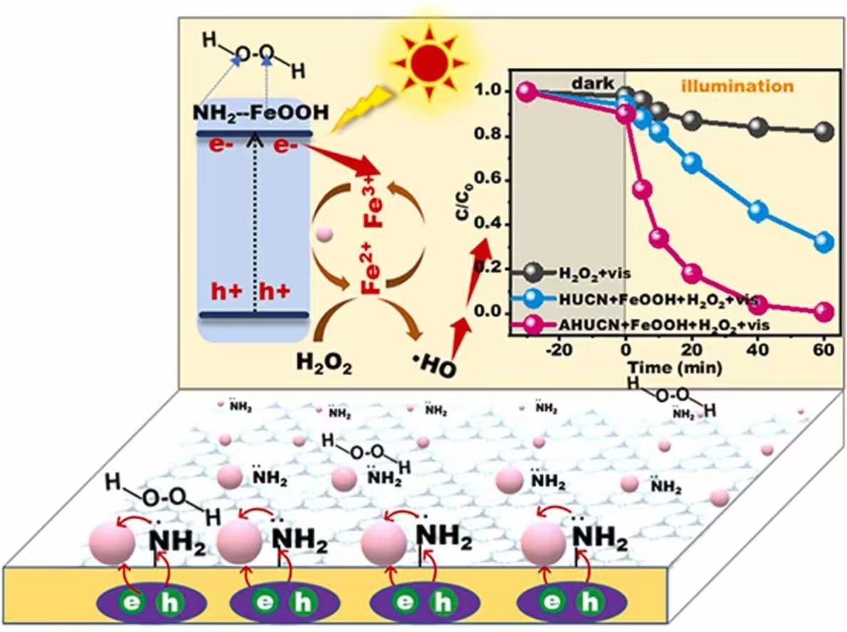 传统光芬顿技术在处理难降解有机废水时面临光生电子-空穴复合率高、芬顿活性中心再生效率低以及催化剂稳定性不足等关键挑战。本研究创新性地提出了一种氨基官能团介导的异质界面精准调控策略,成功构建了FeOOH量子点/富氨基超薄氮化碳(AHUCN/FeOOH)高效异质结催化剂。结果表明,界面处形成的Fe-N化学键可作为高效的电子传输“桥梁”,将光生电子定向引导至芬顿反应中心,极大加速了Fe³⁺/Fe²⁺循环,从而持续活化H₂O₂产生羟基自由基。构建的催化剂对多种抗生素污染物表现出极高的活性,并具备宽广的pH适用性和优异的循环稳定性,且在模拟实际污水中展现出高效性能。该工作提供了一种通过调控载体表面微环境来构筑定向电子通道的通用性策略,为设计高效、稳定的高级氧化水处理技术与材料提供了新的理论依据和实践方案。